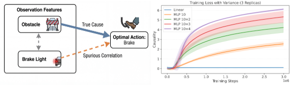 In this controlled setup, an optimal linear policy exists that can solve the task. However, we found that standard gradient descent fails to find this solution in linear models. By increasing network depth and adding non-linearity, the optimization process is better able to overcome spurious correlations. These results suggest that increased capacity and depth do not just improve performance—they actively facilitate the discovery of true causal signals during training.