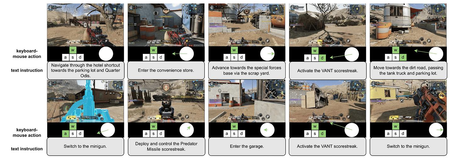 We release a large-scale dataset of high-quality human gameplay spanning diverse 3D video games including FPS (DOOM, Quake, Call of Duty, etc.), racing (Need for Speed, etc.), Roblox games, and other popular video games. All gameplay is recorded at 20 FPS by experienced players. Each frame is annotated with keyboard and mouse actions, and text instructions are provided when available.